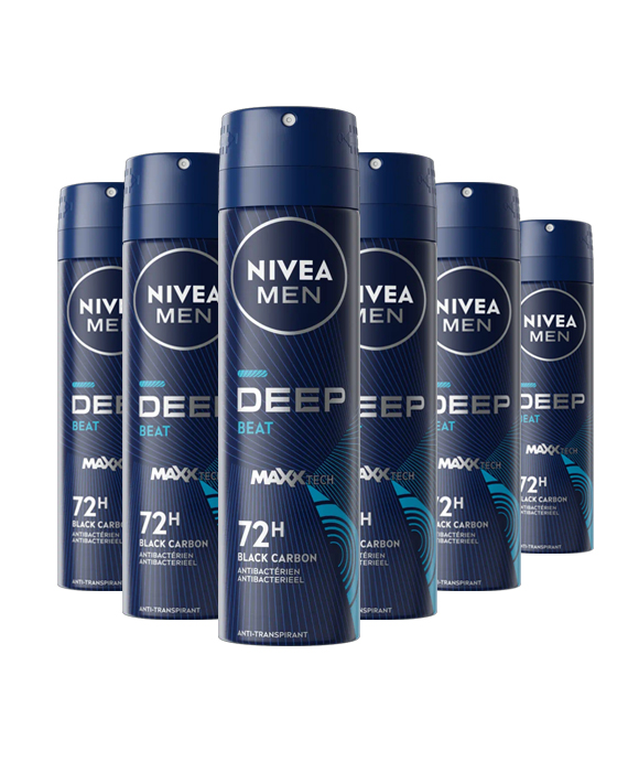 NIVEA MEN DEEP Beat Anti-Transpirant Spray biedt een droog en schoon huidgevoel, zelfs na de meest actieve dagen. De krachtige formule met Black Carbon, versterkt met MAXXTECH, zorgt voor langdurige bescherming tegen zweet en geur. De deo spray biedt 48 uur betrouwbare anti-transpirant bescherming en een frisse geur die je de hele dag verfrist.Met de unieke geur van Woody Harmony, die moderne houtachtige tonen combineert, biedt deze deodorant voor mannen een baanbrekende geur die je zintuigen ontketent. Het beschermt ook krachtig tegen bacteriën, zonder zichtbare zwarte resten op de huid achter te laten, waardoor je je altijd schoon en droog voelt.